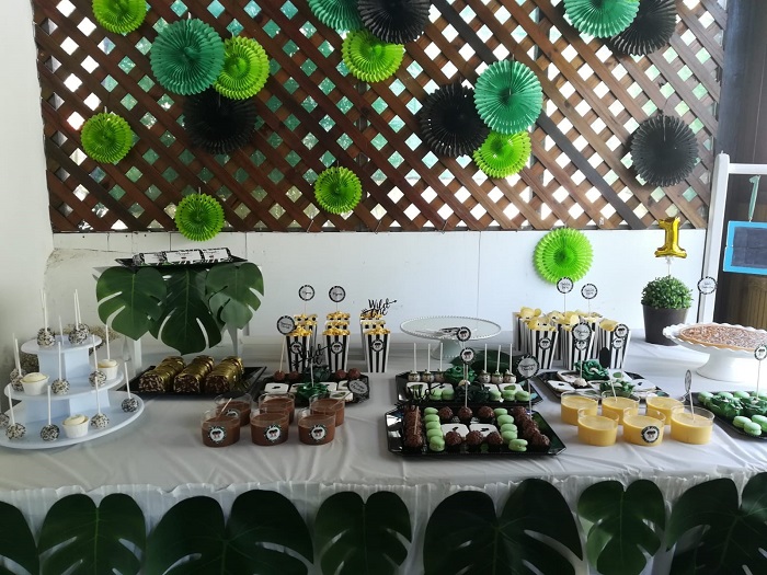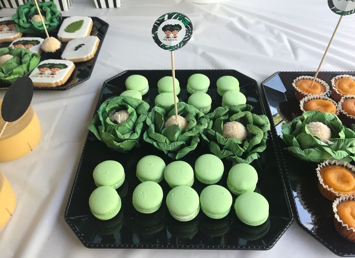 Aqui sinto que falhei. Fiquei um pedacinho triste pois não consegui completar a visão que tinha para esta festa. Três horas para decorar tudo não chegou e fui obrigada a simplificar e a relativizar. Repeti vezes sem conta dentro da minha cabeça “Não te chateies, o importante é estarmos todos reunidos”. Fiquei com imensos balões por encher, e caso não tivesse os 4 balões da Docinho de açuçar ( o numero 1 de um metro, um F e um P com 80 cms prateados e uma estrela verde com 50cms), esta seria possivelmente a primeira festa infantil sem um único balão. Shame on me! Sobraram imensos balões de papel tipo santos populares que seriam para pendurar nas arvores, mas… que não saíram dos sacos. Porem todos foram super gentis e queridos comigo e elogiaram tudo de uma forma muito querida. As costelas de adão, as frases soltas colocadas pontualmente aqui e ali, as caixinhas de pipocas e de batatas fritas, a personalização der todos os artigos foram largamente elogiados, não sei se por cortesia ou por mérito real. E a peça criada especialmente para os nossos pequeninos pela tao talentosa Sara da Rocknbake e as formas de de papel da Sara A oficina da flor foram sem duvida pormenores que fizeram a diferença e me ajudaram a ouvir tantos elogios.