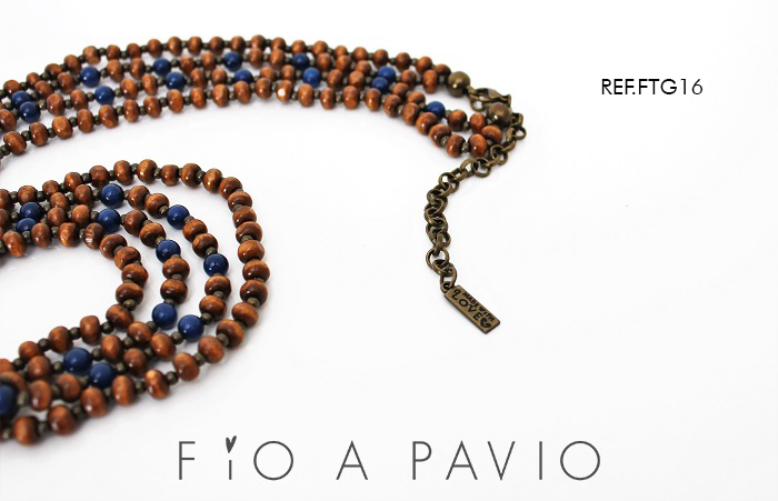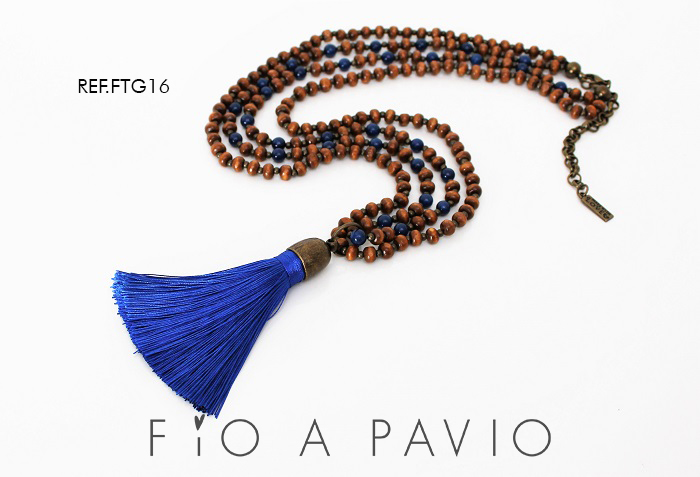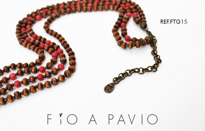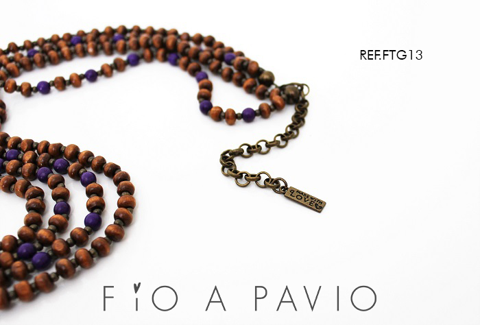 Estes fios com missangas de madeira, castanha, com verniz incolor intercaladas por outras mais pequeninas em dourado envelhecido são a escolha perfeita para completar os seus looks. Pontualmente existem missangas coloridas que lhes conferem um toque de originalidade e cor. Para coroar este design existe ainda na extremidade um berloque colorido em seda no mesmo tom das missangas coloridas: Roxo, Verde garrafa, Coral/laranja e Azul royal.