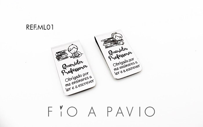 Marcadores de livros tipo clip em aço inoxidável com gravação personalizável, neste caso dedicada aos professores, mas poderá ser o texto que desejar (mediante orçamento).
