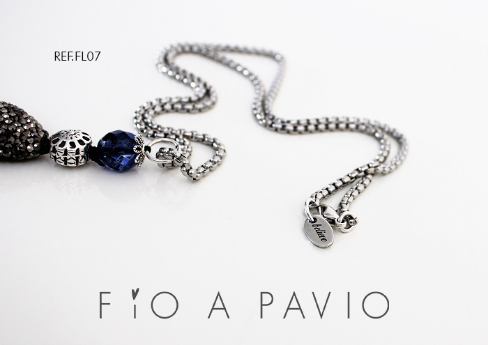 São fios em corrente de aço (material que não oxida, não perde a cor) com 82 cms de comprimento e fecho em zamac (material que não oxida nem deforma com banho de prata), medalha redonda em aço com logotipo da FIOAPAVIO, e com um pendente (em liga metálica que pode conter uma percentagem de níquel) arrendado com flores e cerca de 25mms de diâmetro, que abre, e que contem um guizo em forma de bola com 18 mms de diâmetro de cor branca.