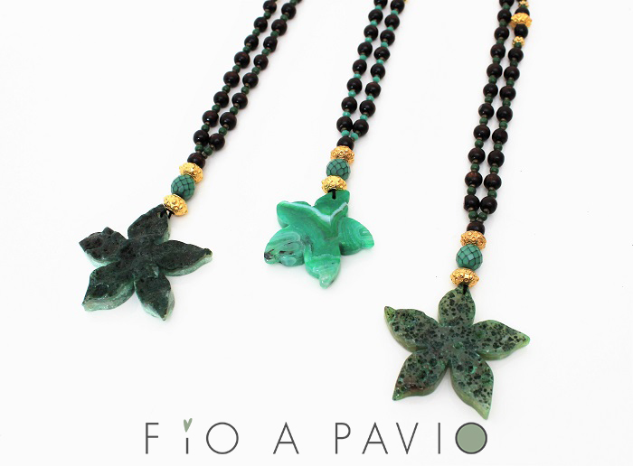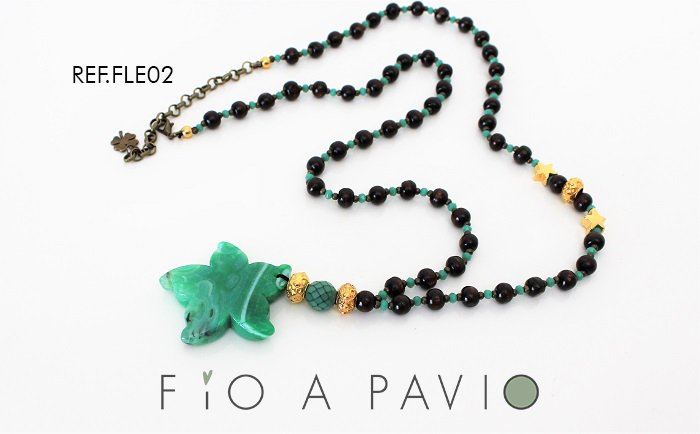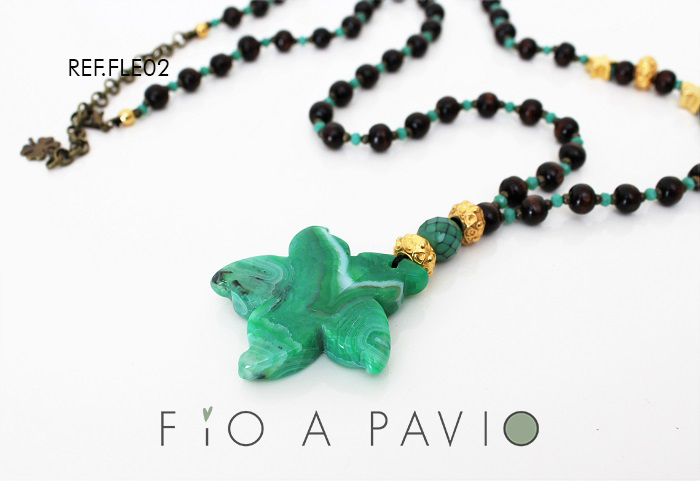 REF.FLE01 e REF.FLE03 fios com 50cms de comprimento (desde o fecho até ao fim da folha de jade) com missangas de madeira envernizadas castanhas (com 8mm de diâmetro), intercaladas com missangas de pedra redondas verdes escuras e missangas em dourado envelhecido, com detalhes em missangas douradas em zamac trabalhadas (com banho de ouro ligeiro) e pendente em Jade em forma de folha de cinco pontas.  As peças de Jade possuem dois lados diferentes, de um lado a pedra está polida e do outro apresenta as suas porosidades.