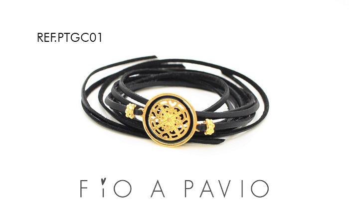 Uma pulseira com fio preto com dois lados, de um lado cabedal do outro camurça, com dois comprimentos para dar 3 ou 2 voltas (a gosto) e uma peça trabalhada em forma de circulo, em zamac com ligeiro banho de ouro (material que não oxida nem deforma) com 23mm de diâmetro e pormenor em preto, e duas missangas no mesmo material e acabamento.