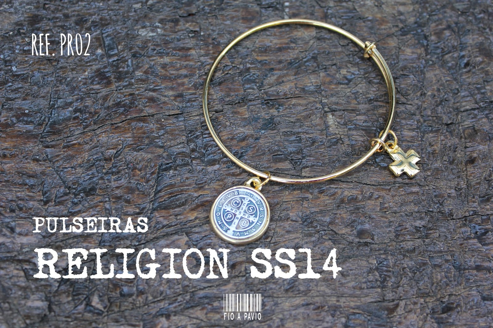 | Pulseira em zamac, dourada, com imagem de São Bento com duas faces diferentes, prateada com rebordo dourado, e cruz pequenina. |